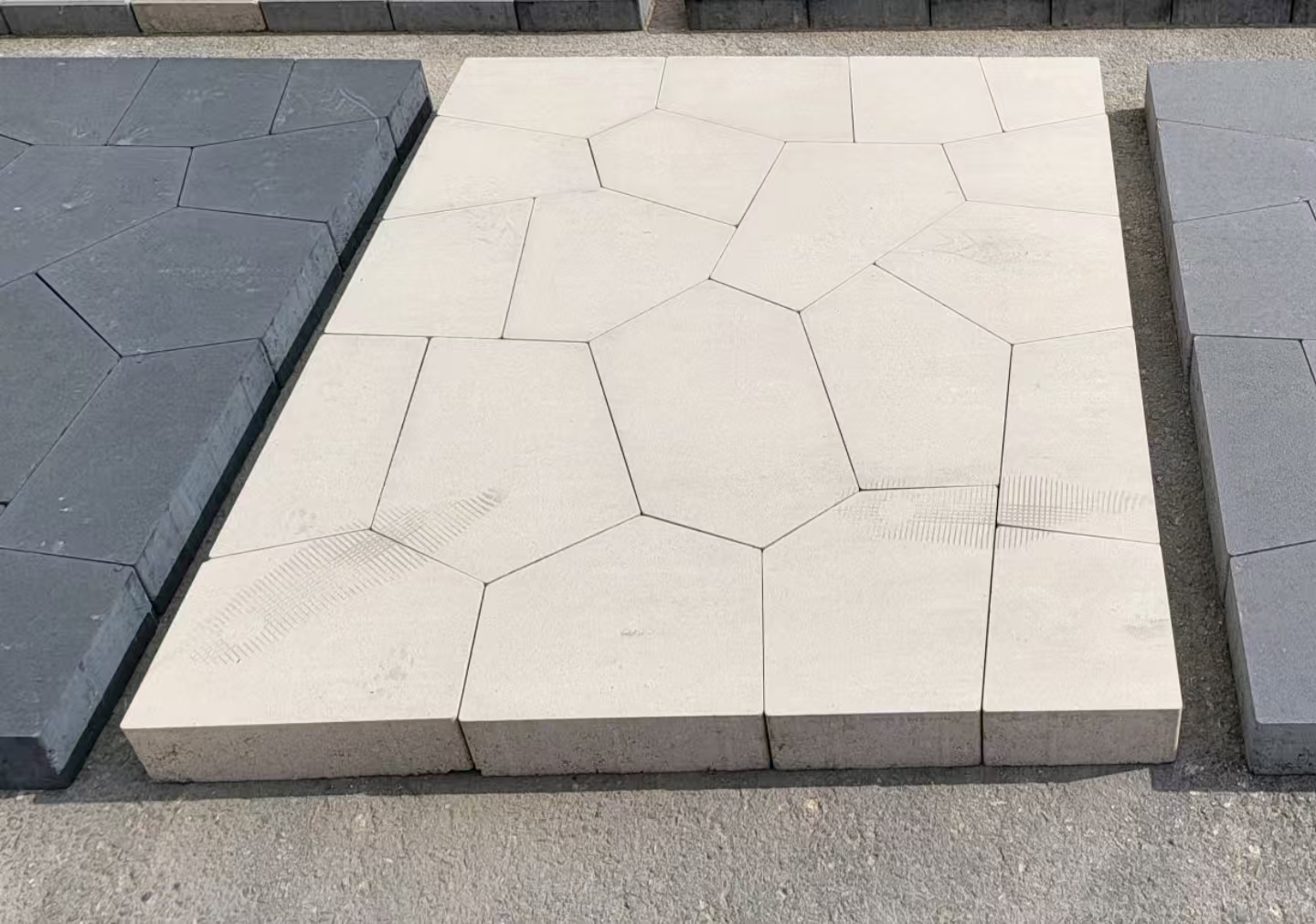 在实用性能上,组合砖砖体拼接紧密、铺设稳固,具备优异的防滑、耐磨、抗压与抗老化性能,能够轻松应对户外日晒雨淋、行人车辆频繁踩踏等复杂使用环境,长期使用不易破松动、开裂;同时其灵活的拼接结构,让现场施工布局更自由,后期维护与局部更换也更为便捷,真正实现了美观性与实用性的双重统一。